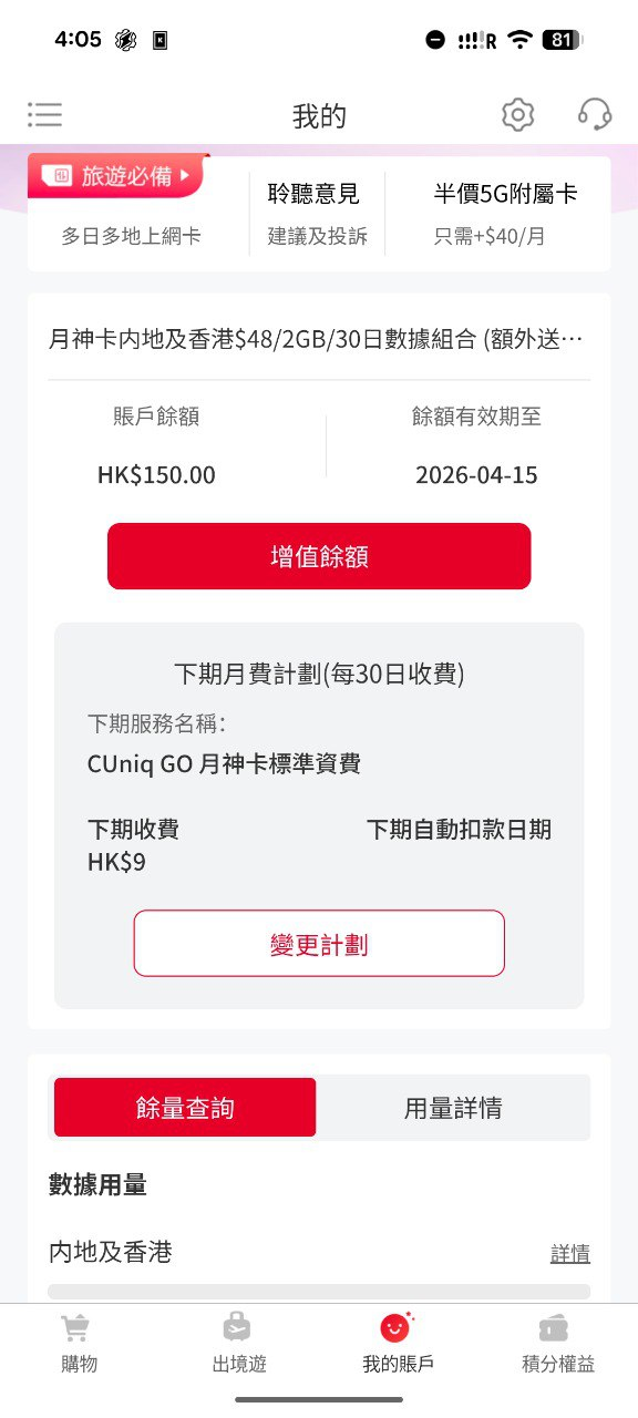 實名後在App MYCUniq 改成每30天 HK$9 的計畫完成保號。